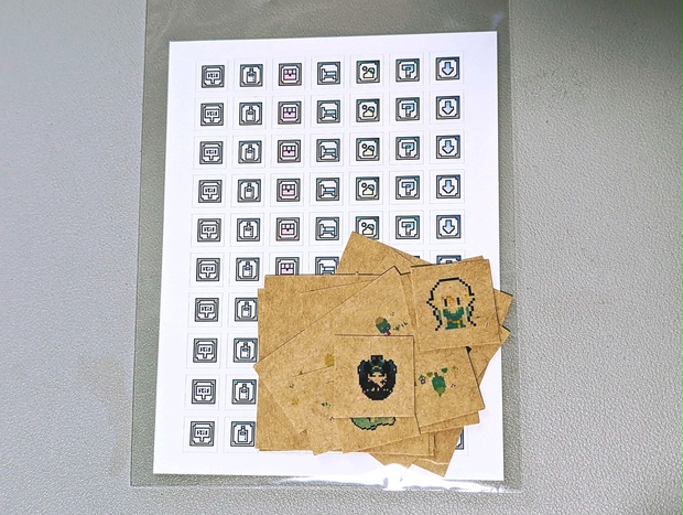 ゲームのために作ったドット絵などを使ったシールです。 ・7柄*10個のアイコンのシート ・カット済みクラフト紙シール12柄(1枚づつ)