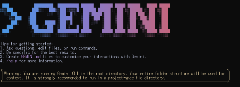 - インストール後、入力行に「gemini」と打ち込み、geminiを呼び出す