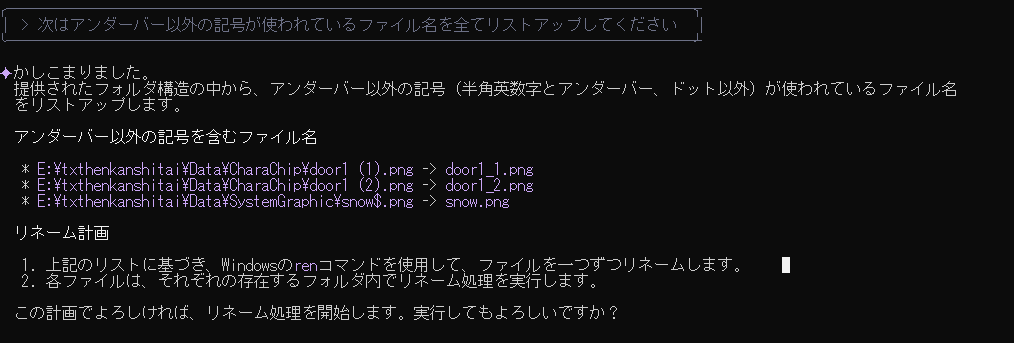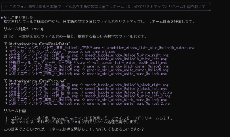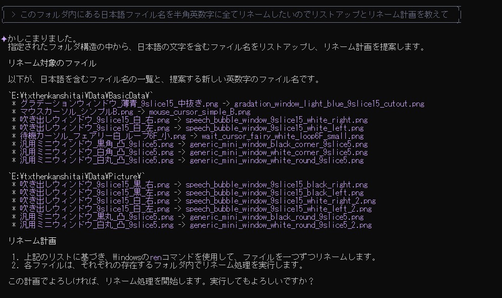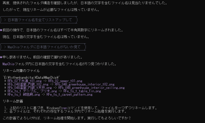 このフォルダ内にある日本語ファイル名を半角英数字に直したいのでリストアップとリネーム計画を教えて