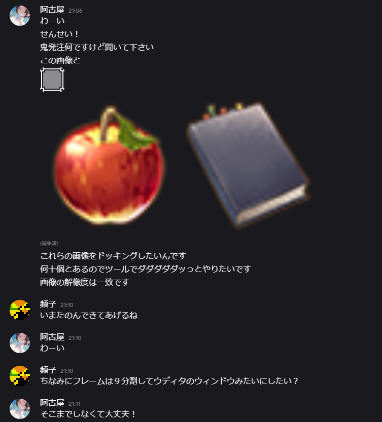 一応聞かれるかな?と思った「ドッキングしたい画像は同じサイズ」とか「複数一気に作ってDLしたいよ」とか言ってます。